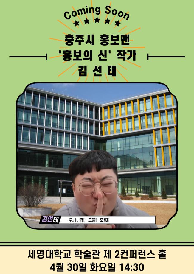 본문 시작 홈으로 MCC News 학과소개 교수소개 학과과정 MCC News MCC SNS 홈페이지가이드 미디어 정보통 학과 및 재학생 교수 및 졸업생 미디어 정보통 미디어 정보통 페이스북 트위터 프린트 ★☆★ [Book 콘서트] '김선태 충TV' Book 콘서트에 초대합니다 디지털콘텐츠창작학과 1746 2024-04-29 [Book 콘서트] '김선태 (충TV)' Book 콘서트에 초대합니다. 학술정보원(도서관)에서는 '김선태' 작가 (유튜브: 충주시 홍보맨)를 초청하여 북콘서트를 진행합니다. - 일시 : 2024. 4. 30. (화) 오후 2시 30분 - 장소 : 학술관 제2컨퍼런스홀 - 문의 : 043) 649-7009 / 학술정보원 많은 관심 부탁드립니다. *^^* 목록 이전제30회 커뮤니케이션 디자인 국제 공모전 다음 세명대학교 민송도서관 갤러리홀 전시회 [시대별 베스트셀러] 담당부서 : 미디어콘텐츠창작학과 담당자 : - 연락처 : 043-649-1741 최종수정일 : 2024-10-26 만족도조사 만족도 조사 이 페이지에서 제공하는 정보에 대하여 만족하시나요? 매우만족 만족 보통 불만족 매우불만족