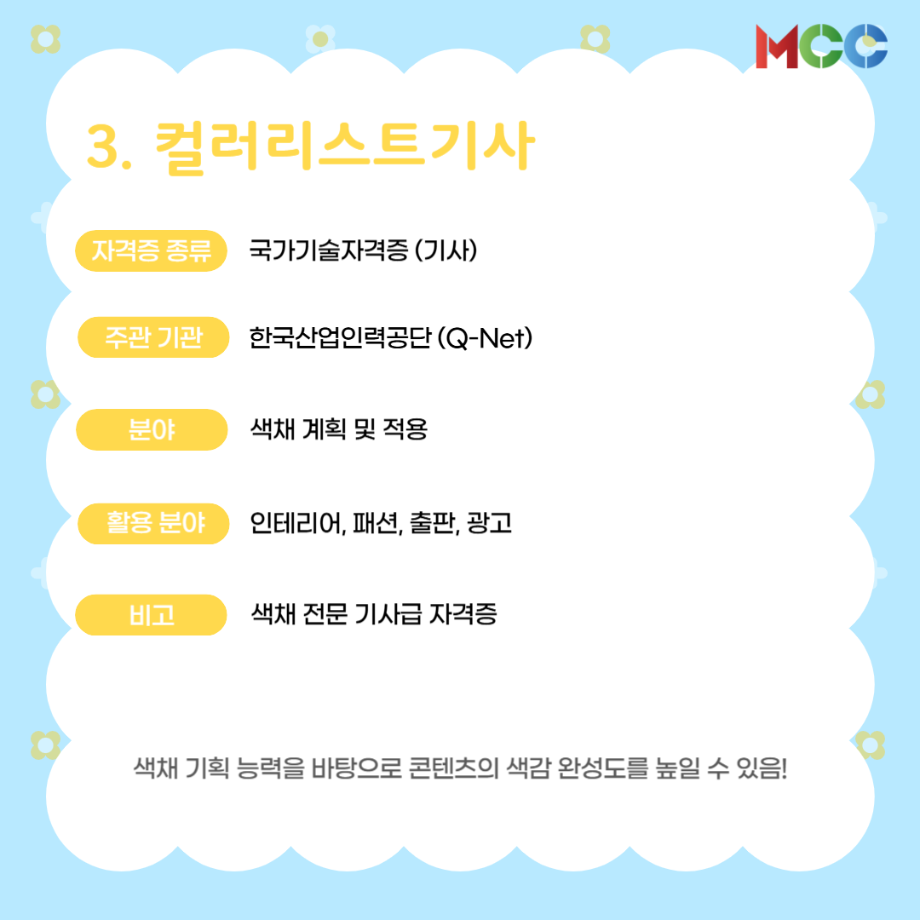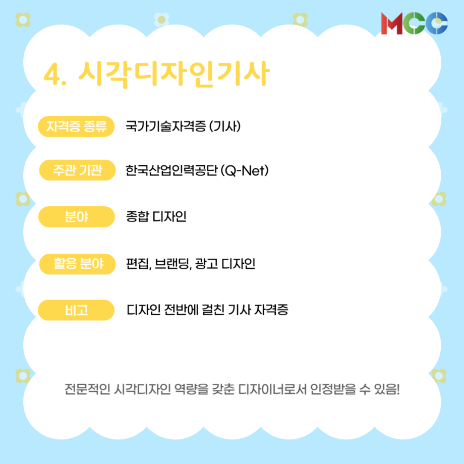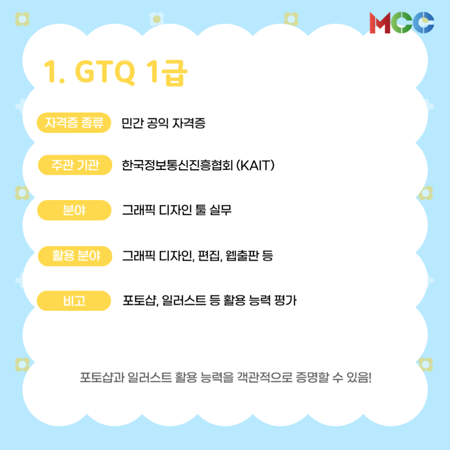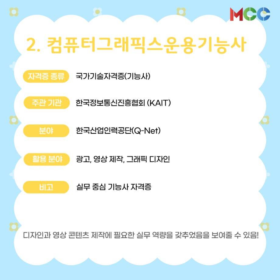 본문 시작 홈으로 MCC News 학과소개 교수소개 학과과정 MCC News MCC SNS 홈페이지가이드 미디어 정보통 학과 및 재학생 교수 및 졸업생 미디어 정보통 미디어 정보통 페이스북 트위터 프린트 미콘창 학생들을 위한 자격증 추천 리스트⭐ 미디어콘텐츠창작학과 1160 2025-06-27 방학 동안 자격증 준비를 해보는 건 어떨까요? 1. GTQ 1급 2. 컴퓨터그래픽스운용기능사 3. 컬러리스트기사 4. 시각디자인기사 5. ACA premiere pro 자세한 내용은 @smu_mcc 인스타그램에서 ! 목록 이전☀️“여름방학에 뭐 하지..?”☀️ 다음 2025 국제평화안보포럼인천 영상 콘텐츠 공모전 담당부서 : 미디어콘텐츠창작학과 담당자 : - 연락처 : 043-649-1741 최종수정일 : 2024-10-26 만족도조사 만족도 조사 이 페이지에서 제공하는 정보에 대하여 만족하시나요? 매우만족 만족 보통 불만족 매우불만족