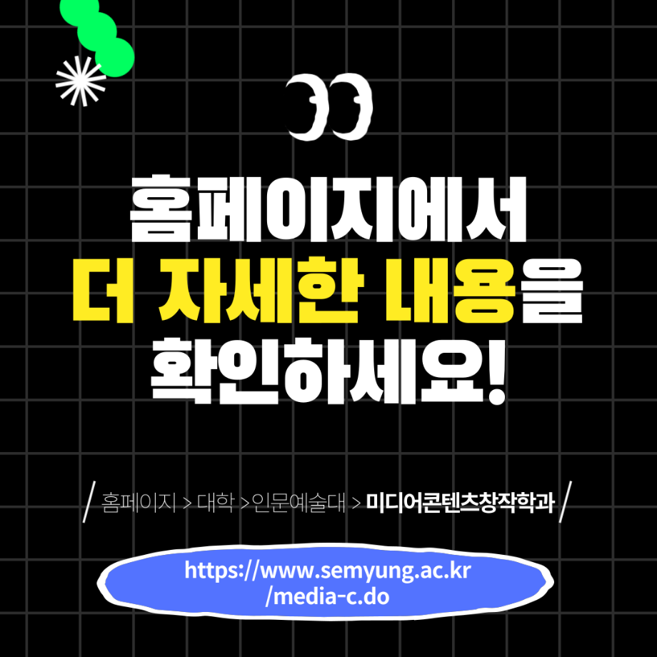본문 시작 홈으로 MCC News 학과소개 교수소개 학과과정 MCC News MCC SNS 홈페이지가이드 미디어 정보통 학과 및 재학생 교수 및 졸업생 미디어 정보통 미디어 정보통 페이스북 트위터 프린트 미디어콘텐츠창작학과 궁금해?! 미디어콘텐츠창작학과 1126 2025-07-21 🎥미디어콘텐츠창작학과❗️궁금해❓📖 영상부터 출판, 그래픽, 소설까지! 내 아이디어를 콘텐츠로 만드는 곳. 창작의 모든 과정을 직접 경험하고, 나만의 이야기를 세상에 전하세요✨ 자세한 내용은 미콘창 인스타그램에서 확인하세요 @smu_mcc 목록 이전여름방학 갈만한 여행지 추천.zip 다음 2025 시청자미디어대상 방송영상공모전 담당부서 : 미디어콘텐츠창작학과 담당자 : - 연락처 : 043-649-1741 최종수정일 : 2024-10-26 만족도조사 만족도 조사 이 페이지에서 제공하는 정보에 대하여 만족하시나요? 매우만족 만족 보통 불만족 매우불만족