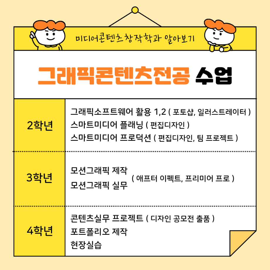 본문 시작 홈으로 MCC News 학과소개 교수소개 학과과정 MCC News MCC SNS 홈페이지가이드 미디어 정보통 학과 및 재학생 교수 및 졸업생 미디어 정보통 미디어 정보통 페이스북 트위터 프린트 🎨 미디어콘텐츠창작학과 | 그래픽 전공 미디어콘텐츠창작학과 1093 2025-09-10 그래픽 전공에서는 디자인의 기초부터 디지털 콘텐츠 제작까지 실무에 필요한 다양한 시각 표현 기술을 배웁니다. 학생들은 직접 작업물을 만들며 디자이너, 영상 그래픽 전문가, 콘텐츠 크리에이터로 성장할 수 있습니다. 목록 이전백억커피 x 곰믹스 AI 활용 영상 공모전 다음 2025학년도 2학기 원어민 교수와의 대화 담당부서 : 미디어콘텐츠창작학과 담당자 : - 연락처 : 043-649-1741 최종수정일 : 2024-10-26 만족도조사 만족도 조사 이 페이지에서 제공하는 정보에 대하여 만족하시나요? 매우만족 만족 보통 불만족 매우불만족