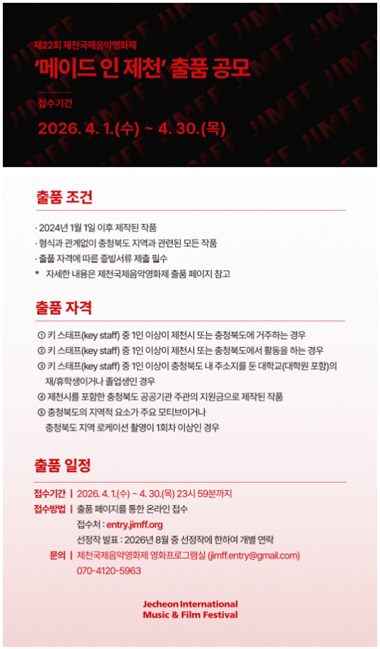 본문 시작 홈으로 학과소식 학과소개 교육과정 학과소식 학과작품 학과SNS 서울대학로 민송아트홀 홈페이지가이드 공모전 공지사항 학과뉴스 공모전 동아리 포토갤러리 공모전 페이스북 트위터 프린트 '메이드 인 제천' 출품 공모 영화웹툰애니메이션학과 13 2026-04-06 목록 이전충북 대학생 문화·관광 홍보영상 제작 공모전 만족도조사 만족도 조사 이 페이지에서 제공하는 정보에 대하여 만족하시나요? 매우만족 만족 보통 불만족 매우불만족
