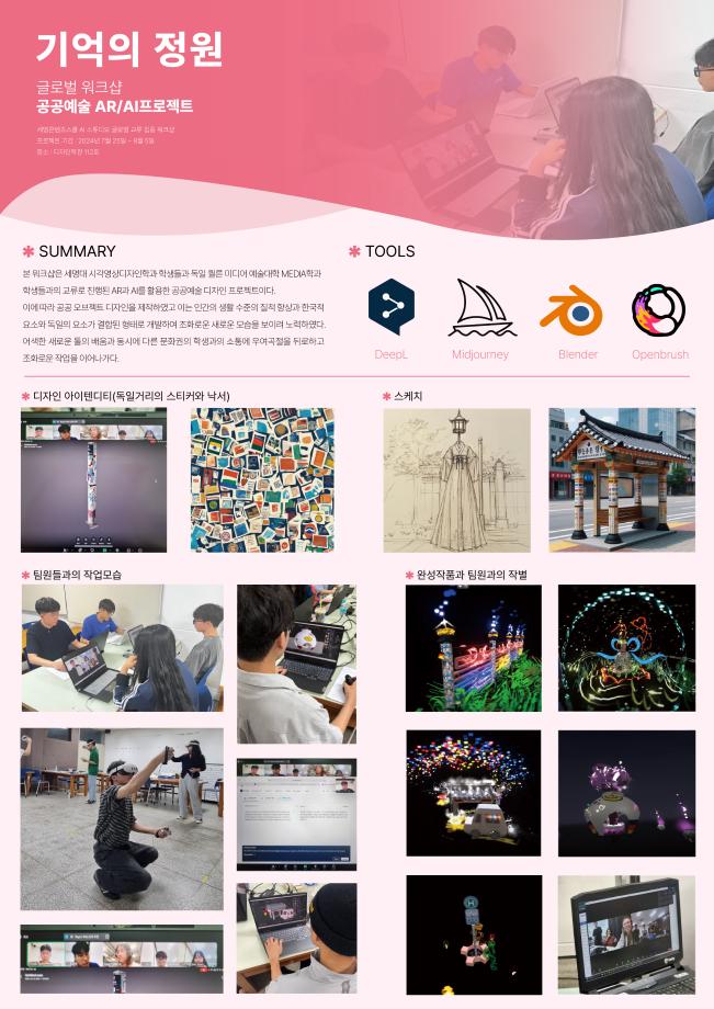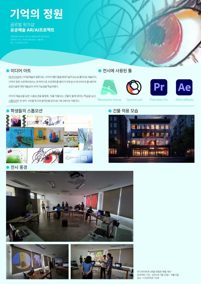 본문 시작 홈으로 AI 학과소개 학과과정 시영소식 입학/취업 AI 학과자랑 SNS소통 홈페이지가이드 AI 콘텐츠 연구소(AI 디자인) 디자인 정보 AI 콘텐츠 연구소(AI 디자인) AI 콘텐츠 연구소(AI 디자인) 페이스북 트위터 프린트 세명 AI 콘텐츠 연구소 - 세명 콘텐츠스쿨(SMCS) 가을 정기 전시회 시각영상디자인학과 788 2025-03-17 2024.12.4~12.13에 진행된 세명 콘텐츠스쿨(SMCS) 가을 정기 전시회에서 글로벌 워크샵 - 공공예술 AR/AI 프로젝트와 생성 AI 디자인 & 생성 AI 영상으로 세명 AI 콘텐츠 연구소가 참여, 전시하였습니다. 목록 이전세명 AI 콘텐츠 연구소 - 성과발표회 참여 다음 세명 AI 콘텐츠 연구소 - AI art & Design 만족도조사 만족도 조사 이 페이지에서 제공하는 정보에 대하여 만족하시나요? 매우만족 만족 보통 불만족 매우불만족