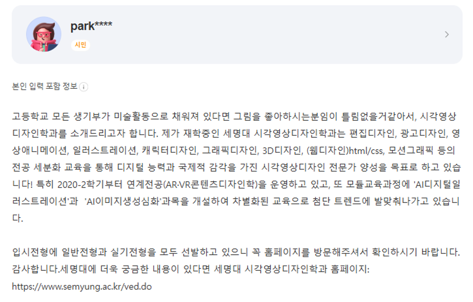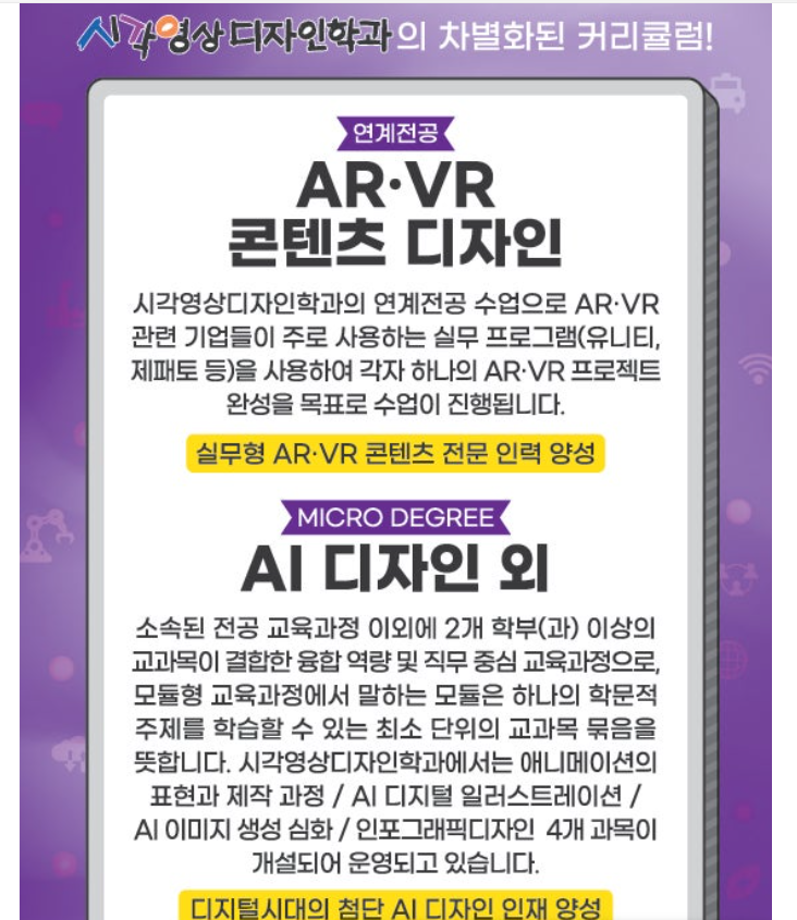 본문 시작 홈으로 입학/취업 학과소개 학과과정 시영소식 입학/취업 AI 학과자랑 SNS소통 홈페이지가이드 입학여기 입학여기 취업지금 전공소개 입학여기 페이스북 트위터 프린트 지식인 학과 답변 ->Q.시각디자인과... 시각영상디자인학과 1810 2024-09-08 지식인 학과 답변 ->Q.시각디자인과... 시각디자인과 : 지식iN (naver.com) http://namose_hyper.link/1726100292275https://www.youtube.com/watch?v=5ifKoX891yY&t=6s 시각영상디자인학과 소개영상! (youtube.com) 목록 이전2025 수시모집 원서접수 안내 다음 시각영상디자인학과 홍보동영상 만족도조사 만족도 조사 이 페이지에서 제공하는 정보에 대하여 만족하시나요? 매우만족 만족 보통 불만족 매우불만족