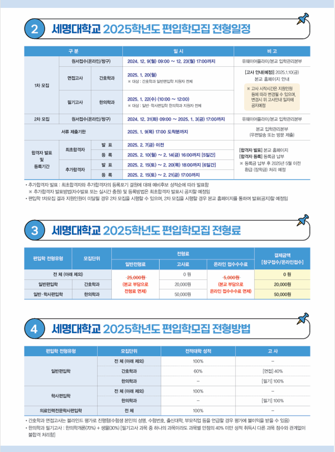※ 편입학모집 결과 지원인원 등이 모집인원에 미달될 경우 2차 모집[2024. 12. 31(화) ~ 2025. 1. 3(금) 17:00까지] 시행 예정