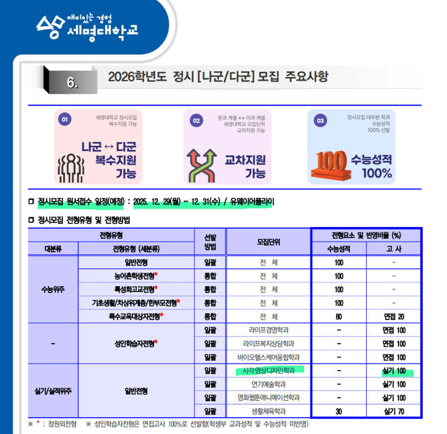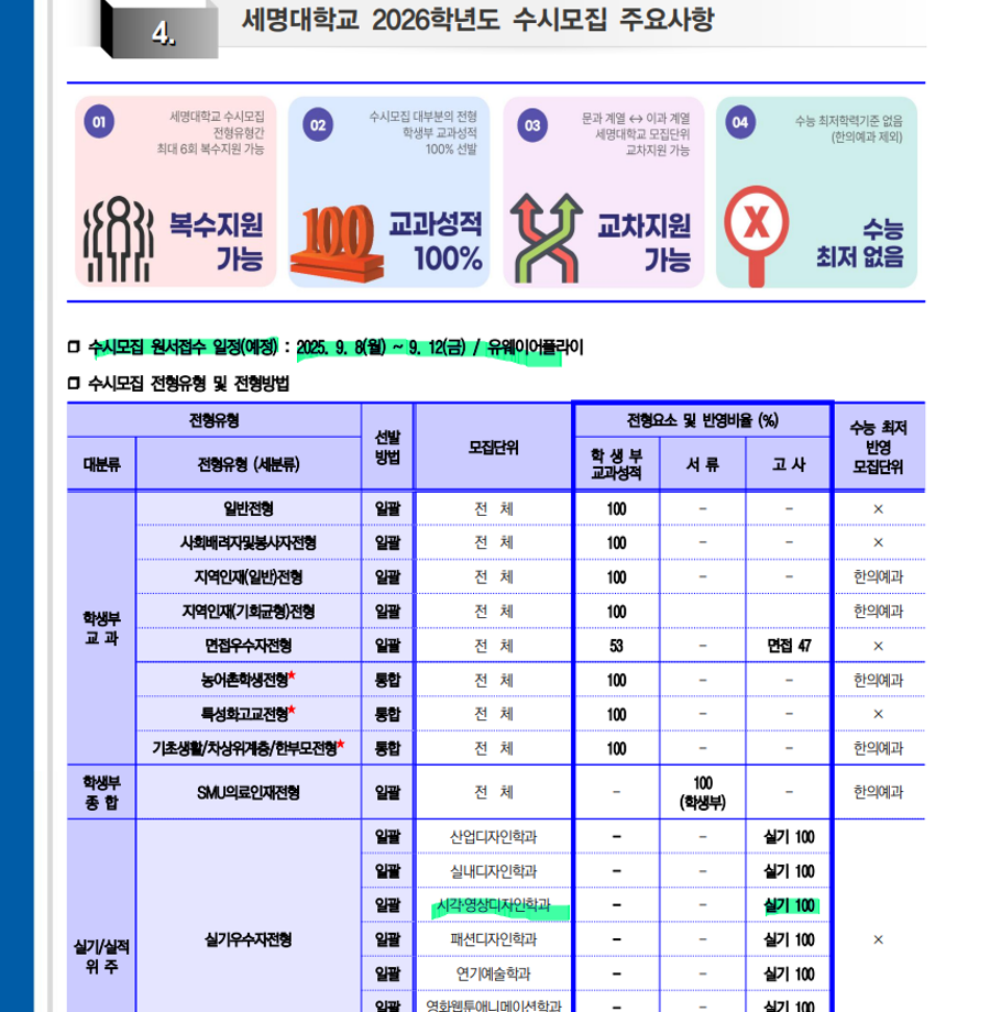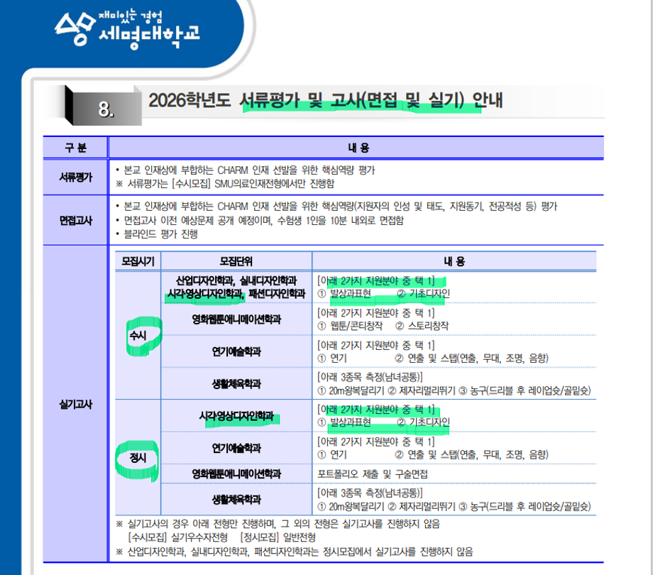 본문 시작 홈으로 입학/취업 학과소개 학과과정 시영소식 입학/취업 AI 학과자랑 SNS소통 홈페이지가이드 입학여기 입학여기 취업지금 전공소개 입학여기 페이스북 트위터 프린트 세명대학교_2026학년도 대학입학전형 시각영상디자인학과 2559 2025-03-12 세명대학교_2026학년도 대학입학전형 자세한 내용은 입학본부 공지 참고하세요 https://www.semyung.ac.kr/cop/bbs/BBSMSTR_000000000350/selectBoardArticle.do?nttId=366035&kind=&mno=sitemap_12&pageIndex=1&searchCnd=&searchWrd= 목록 이전2025 신입생 추가 모집 안내 다음 세명대학교_2026학년도 수시모집- 시각영상디자인학과 만족도조사 만족도 조사 이 페이지에서 제공하는 정보에 대하여 만족하시나요? 매우만족 만족 보통 불만족 매우불만족