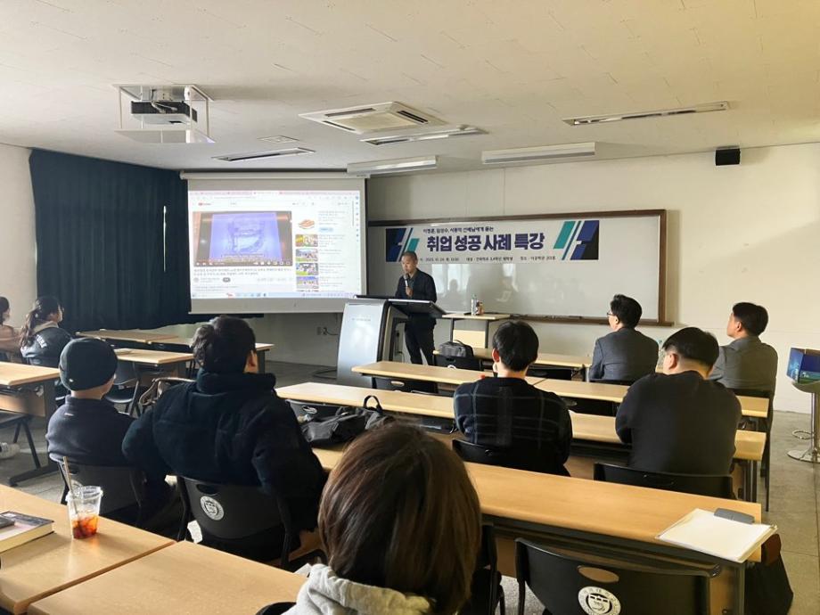 10월 24일 오후 이공학관 201호에서 ‘학과 선배가 들려주는 성공하는 건축인의 길’이란 주제의 재학생-선배 만남의 장 이 펼쳐졌다.㈜서림종합건설 서동억 대표(95학번),㈜선진엔지니어링 임성수 상무(건축사, 95학번)㈜칸그룹건축사 이정훈 대표(건축사, 98학번)가 초청되었는데, 이정훈 동문은 ‘건축’에 자신의 관심분야(유튜브, AI 등)를 연계, 융합하는 방식의 성공사례 소개했고, 임성수 상무는 대규모 건축사무소에서의 업무와 자기발전에 대해, 그리고 서동억 대표는 성 공의 조건으로서 꿈과 목표의 구체화, 열정적 준비와 추진을 강조하였다. 행사를 통해 세 사람의 이야기 식 강의로 선후 배간 공감대가 만들어져 재학생들로부터 많은 질문이 나왔는데, 이는 취업과 성공에 대한 학생들의 높은 관심을 보여 주 는 것으로 풀이된다.