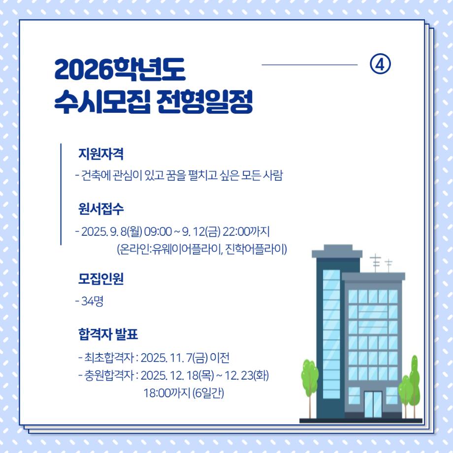 본문 시작 홈으로 커뮤니티 학과소개 교수소개 교육과정 학과 행사 및 활동 커뮤니티 홈페이지가이드 열린정보 학과일정 학과공지 채용정보 및 자료 열린정보 포토갤러리 먹거리, 즐길거리 포토갤러리 사진 사진 영상 사진 페이스북 트위터 프린트 사진 영상 2026학년도 수시모집 - 건축학과 건축학과 998 2025-08-12 목록 이전2025 지역연계 창의융합 캠프 운영 다음 2026 수시주요사항 및 전년도 입시결과 만족도조사 만족도 조사 이 페이지에서 제공하는 정보에 대하여 만족하시나요? 매우만족 만족 보통 불만족 매우불만족