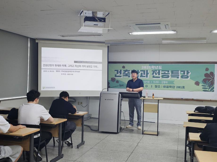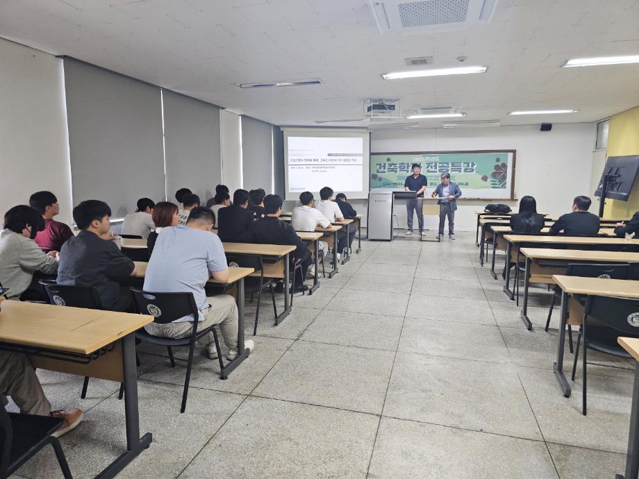 본문 시작 홈으로 학과 행사 및 활동 학과소개 교수소개 교육과정 학과 행사 및 활동 커뮤니티 홈페이지가이드 학과 행사 학과 행사 학과 대외 활동 학생회 및 동아리 학과대내 활동 입학식, 학위수여식 졸업작품전 학과대내 활동 학과대내 활동 페이스북 트위터 프린트 2025학년도 건축학과 전공특강 건축학과 695 2025-05-29 2025학년도 건축학과 전공특강 2025년 5월 28일 수 13:30 / 15:30 한국건설인정책연구원 - 오치돈 재재건축사사무소 -김정태 목록 이전2024학년도 건축학과 전공특강 만족도조사 만족도 조사 이 페이지에서 제공하는 정보에 대하여 만족하시나요? 매우만족 만족 보통 불만족 매우불만족
