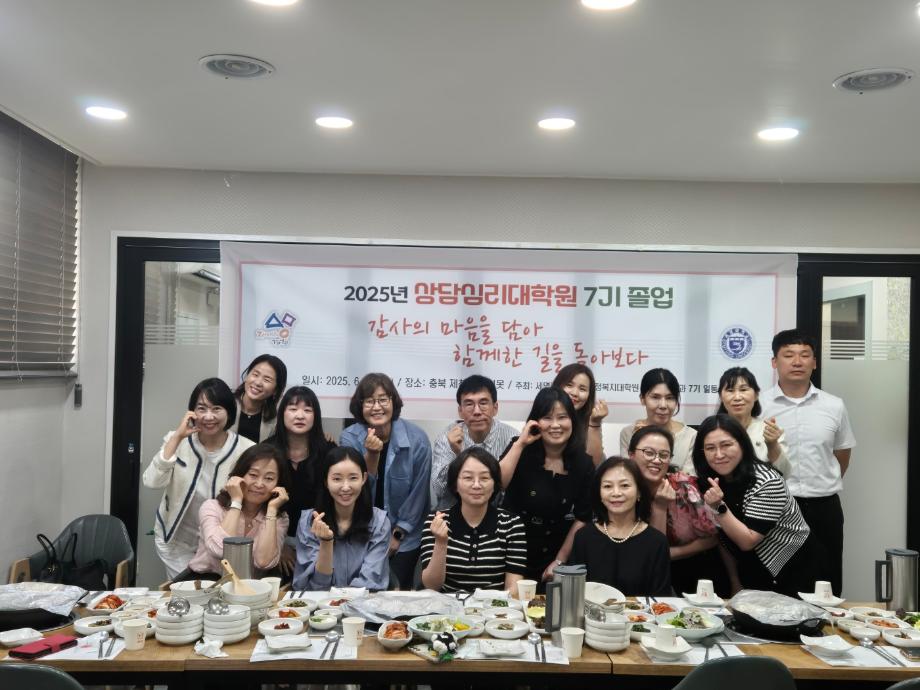 본문 시작 홈으로 대학원 커뮤니티 학부소개 교수소개 교육목표 입학안내 학과 커뮤니티 대학원 커뮤니티 홈페이지가이드 대학원 갤러리 대학원 소식 대학원 일정 대학원 갤러리 대학원 갤러리 페이스북 트위터 프린트 석사과정 사은회 개최 상담심리학과 661 2025-06-19 안녕하십니까 세명대학교 상담심리학과입니다. 7기 석사 과정생분들의 졸업을 기념하여 상담심리학과 교수님들과 함께 식사하는 시간을 가졌습니다! 그동안 수고해주신 교수님들께 꽃다발을 전달하고 수업을 들으며 어려웠던 점, 앞으로의 계획, 감사 인사 등 많은 이야기를 나누며 좋은 시간을 보냈습니다. 졸업을 축하드리며 그동안 고생 많으셨습니다. 졸업 후에도 빛날 여러분들의 앞날을 응원하겠습니다. :) 목록 이전석사과정 현장견학 프로그램 다음 표현예술치료 특강 만족도조사 만족도 조사 이 페이지에서 제공하는 정보에 대하여 만족하시나요? 매우만족 만족 보통 불만족 매우불만족