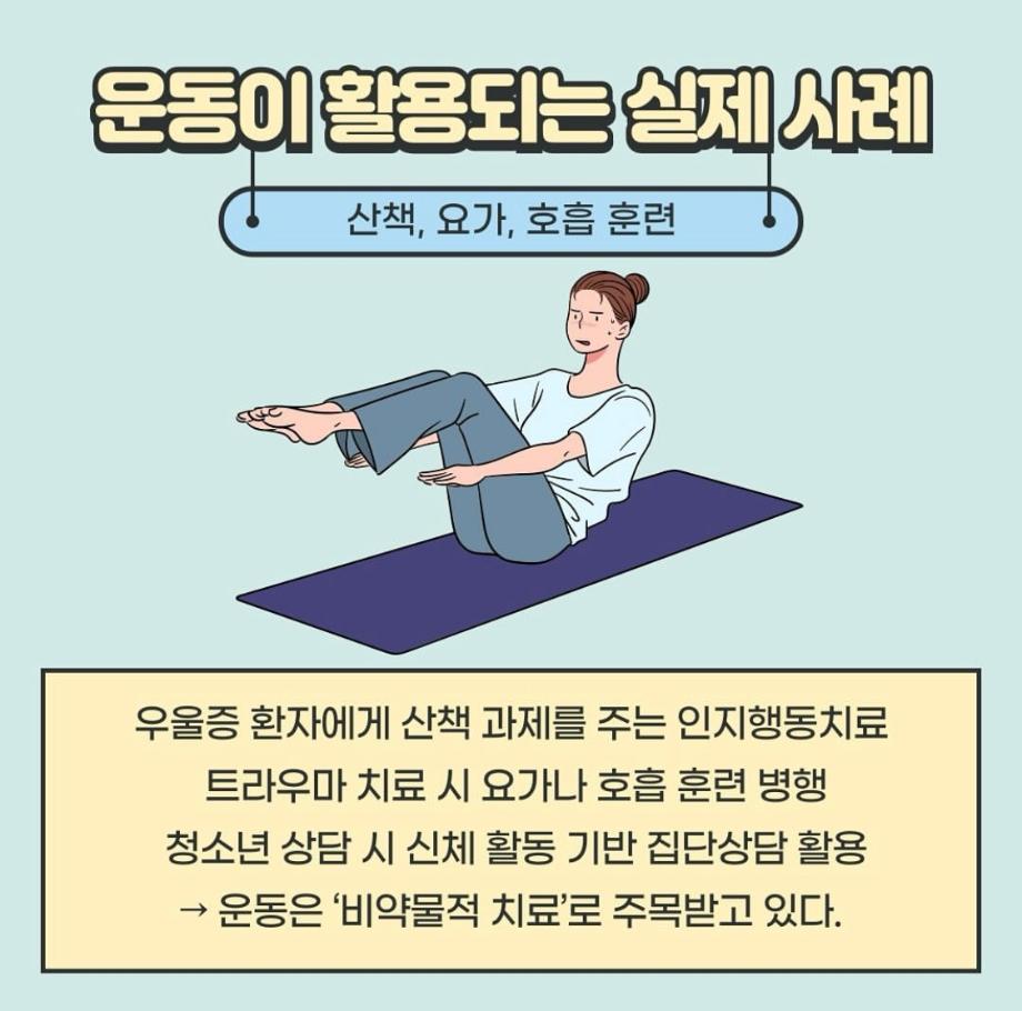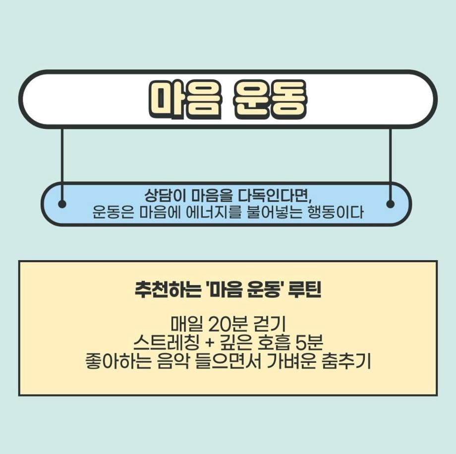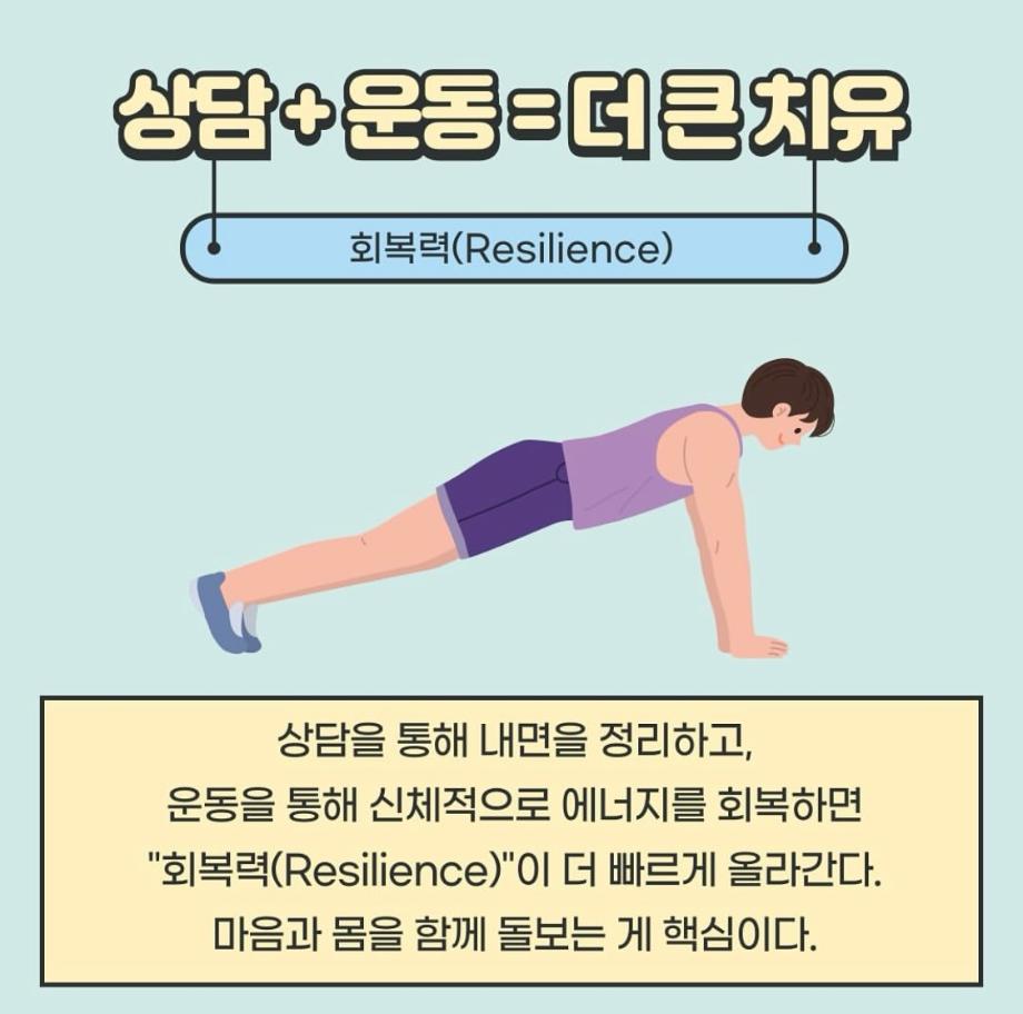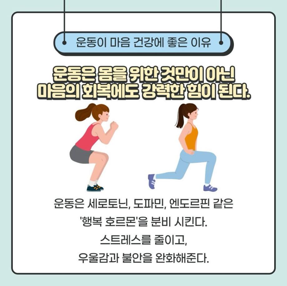 본문 시작 홈으로 학과 커뮤니티 학부소개 교수소개 교육목표 입학안내 학과 커뮤니티 대학원 커뮤니티 홈페이지가이드 학과 갤러리 학과소식 학사일정 학과 갤러리 학과 갤러리 페이스북 트위터 프린트 운동과 상담심리 상담심리학과 818 2025-05-17 안녕하세요 세명대학교 상담심리학과 학생회 오비르입니다 ! 오늘은 운동과 상담심리의 관계에 대해 알려드리겠습니다. 몸을 움직이면 마음도 움직인다! 운동은 세로토닌, 도파민, 엔도르핀 같은 '행복 호르몬'을 분비시켜 스트레스를 줄이고, 우울감과 불안을 완화해 준다고 합니다. 몸과 마음이 지쳐있다면 운동을 통해 회복하는 시간을 가져 보는 건 어떨까요? 목록 이전윤리적 딜레마 & 해결방법 다음 음악이 심리에 미치는 영향 만족도조사 만족도 조사 이 페이지에서 제공하는 정보에 대하여 만족하시나요? 매우만족 만족 보통 불만족 매우불만족