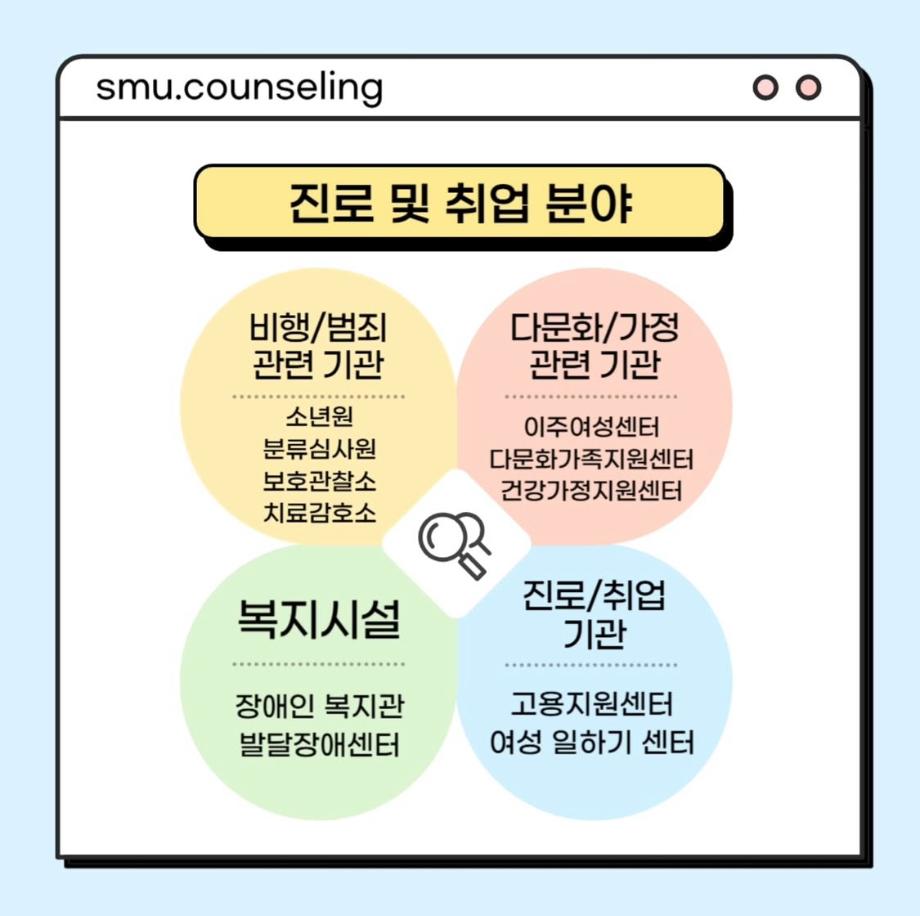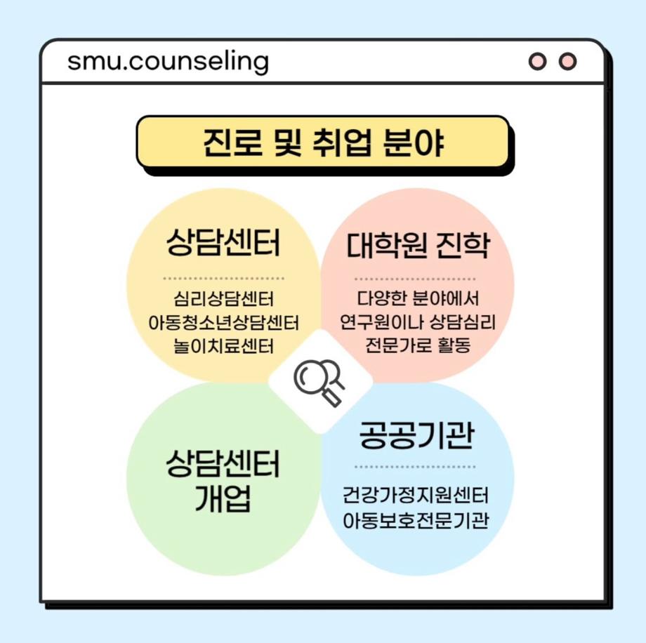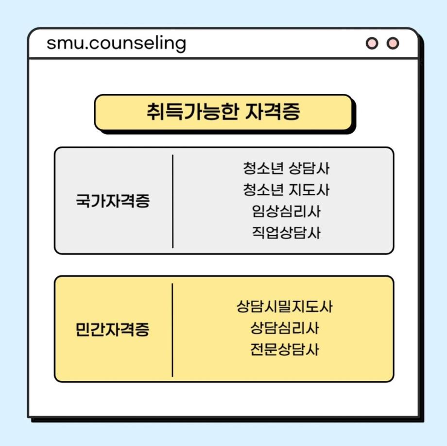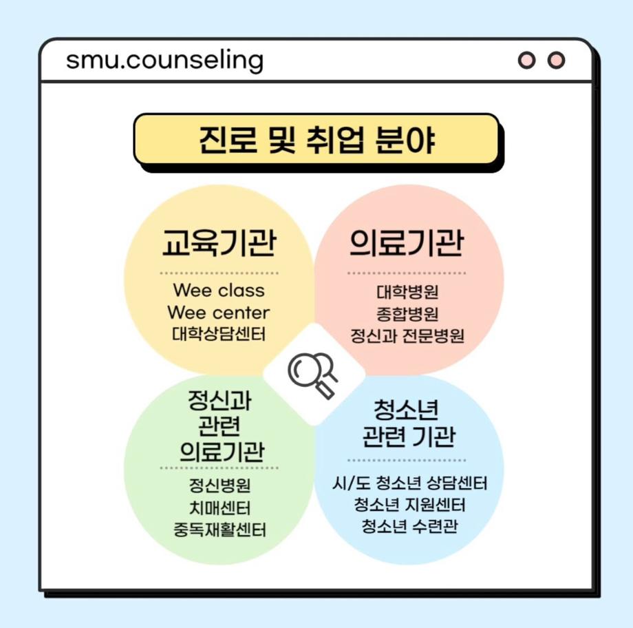 본문 시작 홈으로 학과 커뮤니티 학부소개 교수소개 교육목표 입학안내 학과 커뮤니티 대학원 커뮤니티 홈페이지가이드 학과 갤러리 학과소식 학사일정 학과 갤러리 학과 갤러리 페이스북 트위터 프린트 자격증&진로 소개 상담심리학과 753 2025-07-30 안녕하십니까 세명대학교 상담심리학과입니다! 오늘은 상담사가 되기 위해 필요한 자격증, 취업 분야를 소개해드리려고 합니다. 상담심리학과 졸업 후에는 교육기관, 의료기관, 복지시설 등 다양한 분야에서 활동할 수 있습니다 :) 목록 이전[현직자 인터뷰] 평창군청소년상담복지센터 다음 [현직자 인터뷰] 육군 상담사 만족도조사 만족도 조사 이 페이지에서 제공하는 정보에 대하여 만족하시나요? 매우만족 만족 보통 불만족 매우불만족