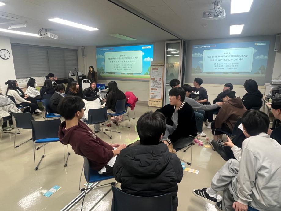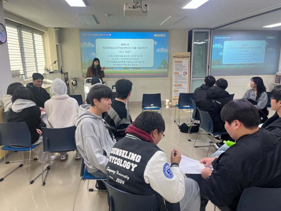 본문 시작 홈으로 학과 커뮤니티 학부소개 교수소개 교육목표 입학안내 학과 커뮤니티 대학원 커뮤니티 홈페이지가이드 학과 갤러리 학과소식 학사일정 학과 갤러리 학과 갤러리 페이스북 트위터 프린트 2025학년도 2학기 현장견학 상담심리학과 529 2025-11-20 안녕하세요 세명대학교 상담심리학과입니다! 지난 3일 상담심리학과 1, 2학년 학생들은 제천시청소년상담복지센터로 현장견학을 떠났습니다! 센터 견학과 퀴즈 프로그램을 통해 상담복지센터에 대해 알 수 있는 뜻깊은 시간이 됐습니다. 오늘의 견학이 앞으로의 진로에 도움이 되고 결정할 수 있는 데에 필요한 시간이 되었으면 합니다 :) 목록 이전나와 어울리는 심리이론은? 다음 12월 학사일정 만족도조사 만족도 조사 이 페이지에서 제공하는 정보에 대하여 만족하시나요? 매우만족 만족 보통 불만족 매우불만족